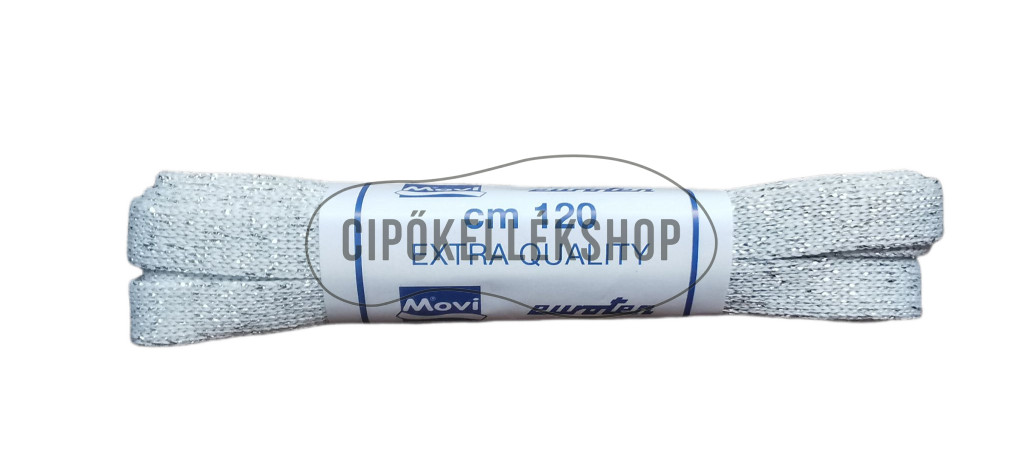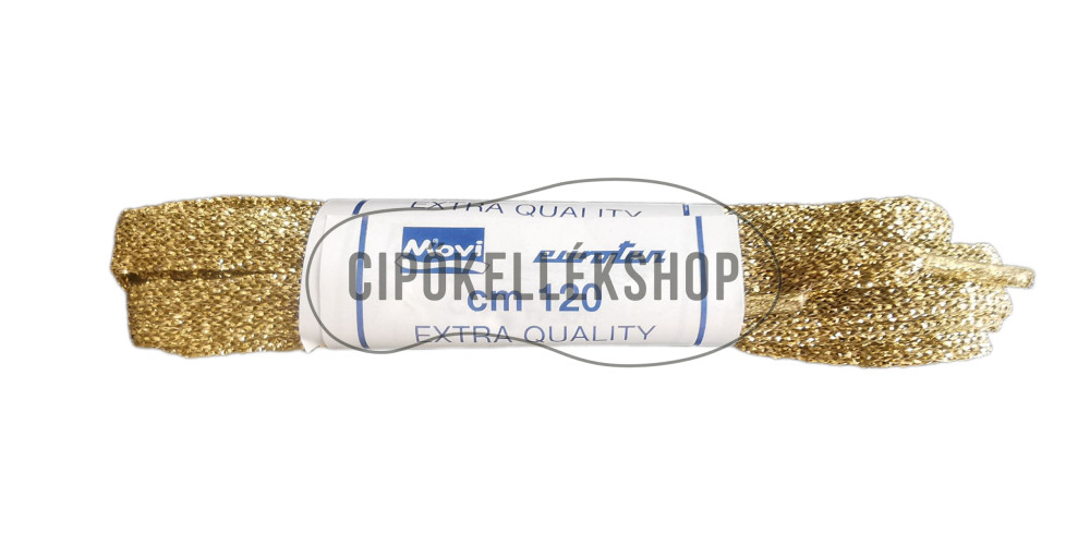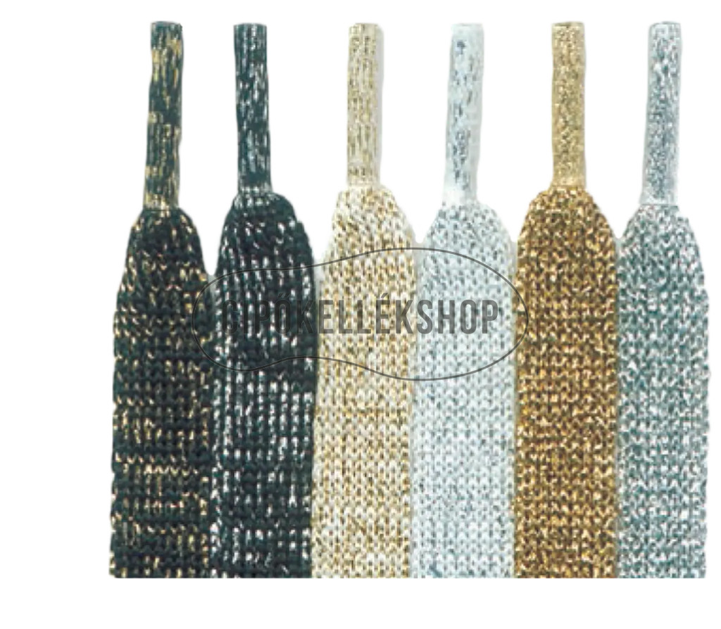 Csillogó Lurex cipőfűző – 120 cm-es, 10 mm széles, lapos kivitelben. Egyedi, fényes megjelenés arany, ezüst és kombinált színekben, sneakerekhez, félcipőkhöz, divatcipőkhöz.